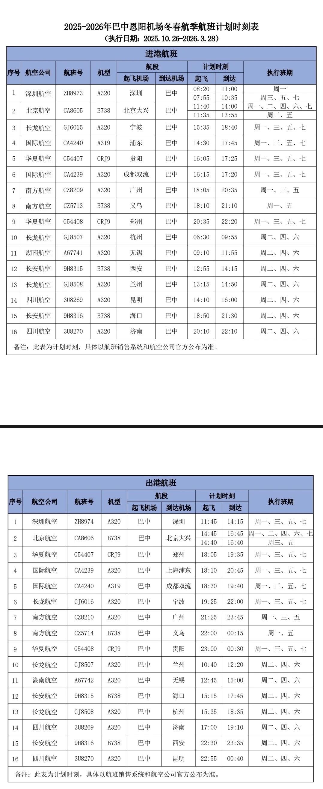 巴中恩阳机场2025-2026冬春航季航班计划
