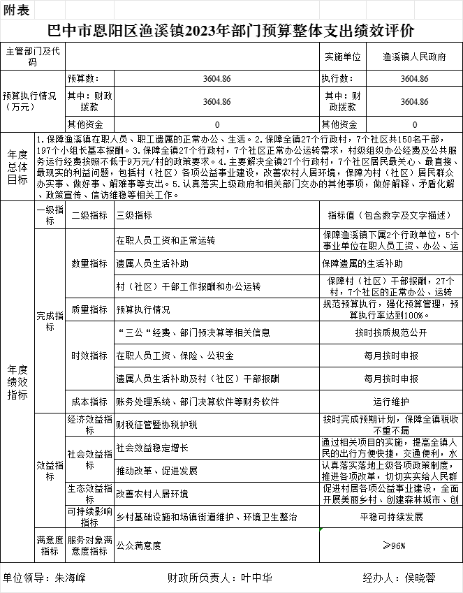 根据预算绩效管理要求,本部门对2023年部门整体开展绩效自评,《2023年渔溪镇部门整体绩效评价报告》见附件(第四部分)。